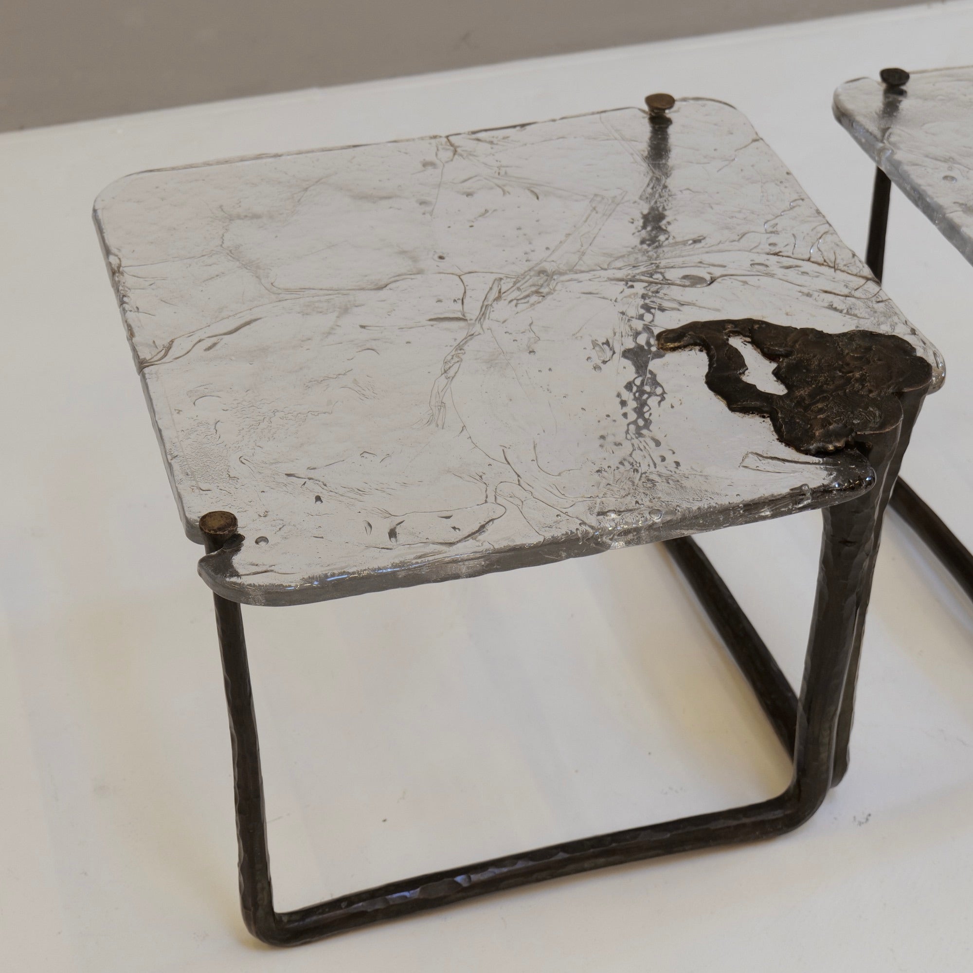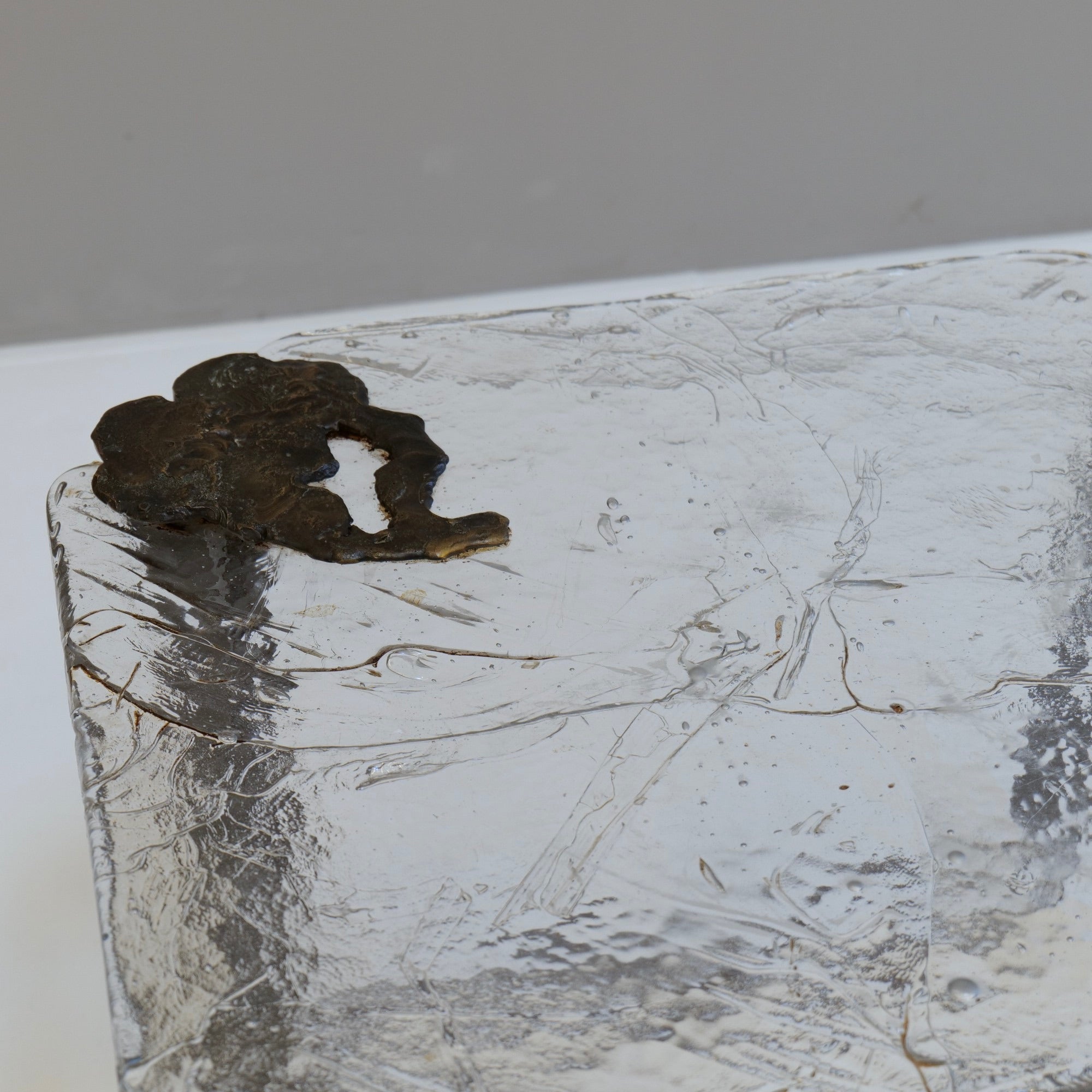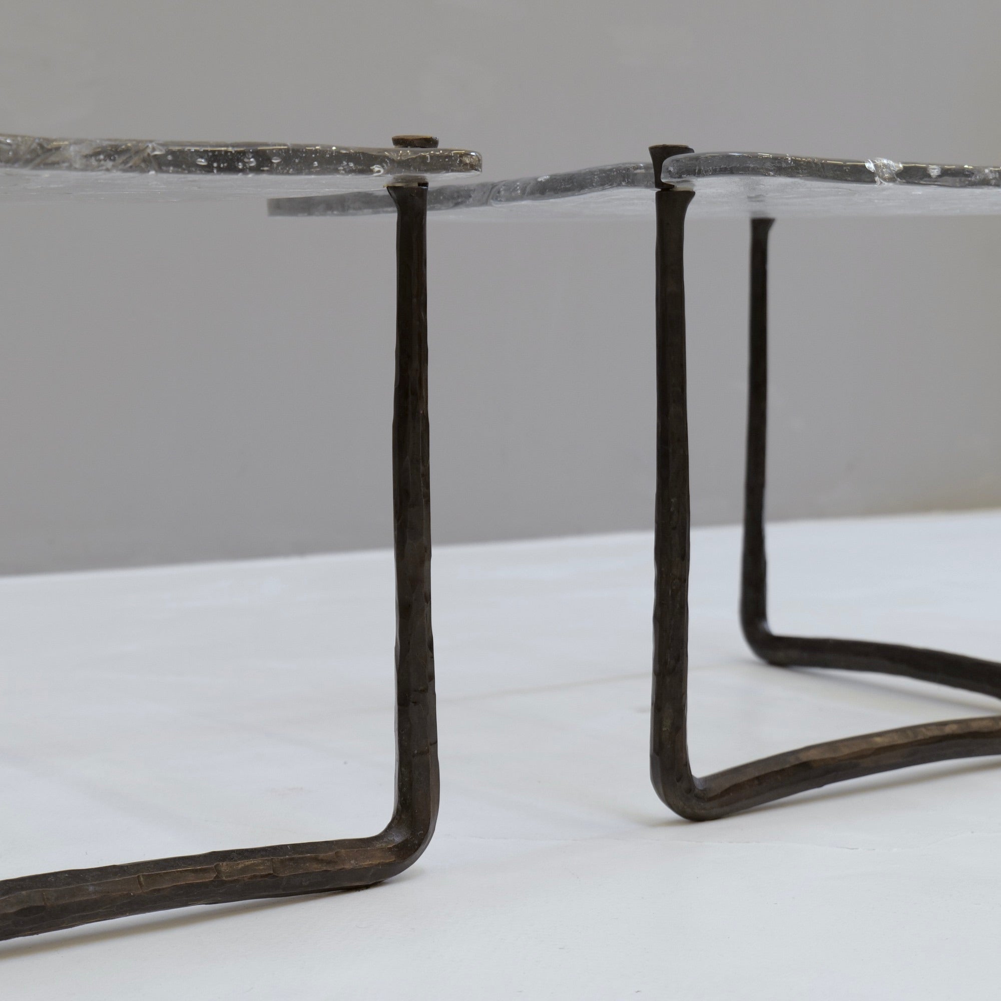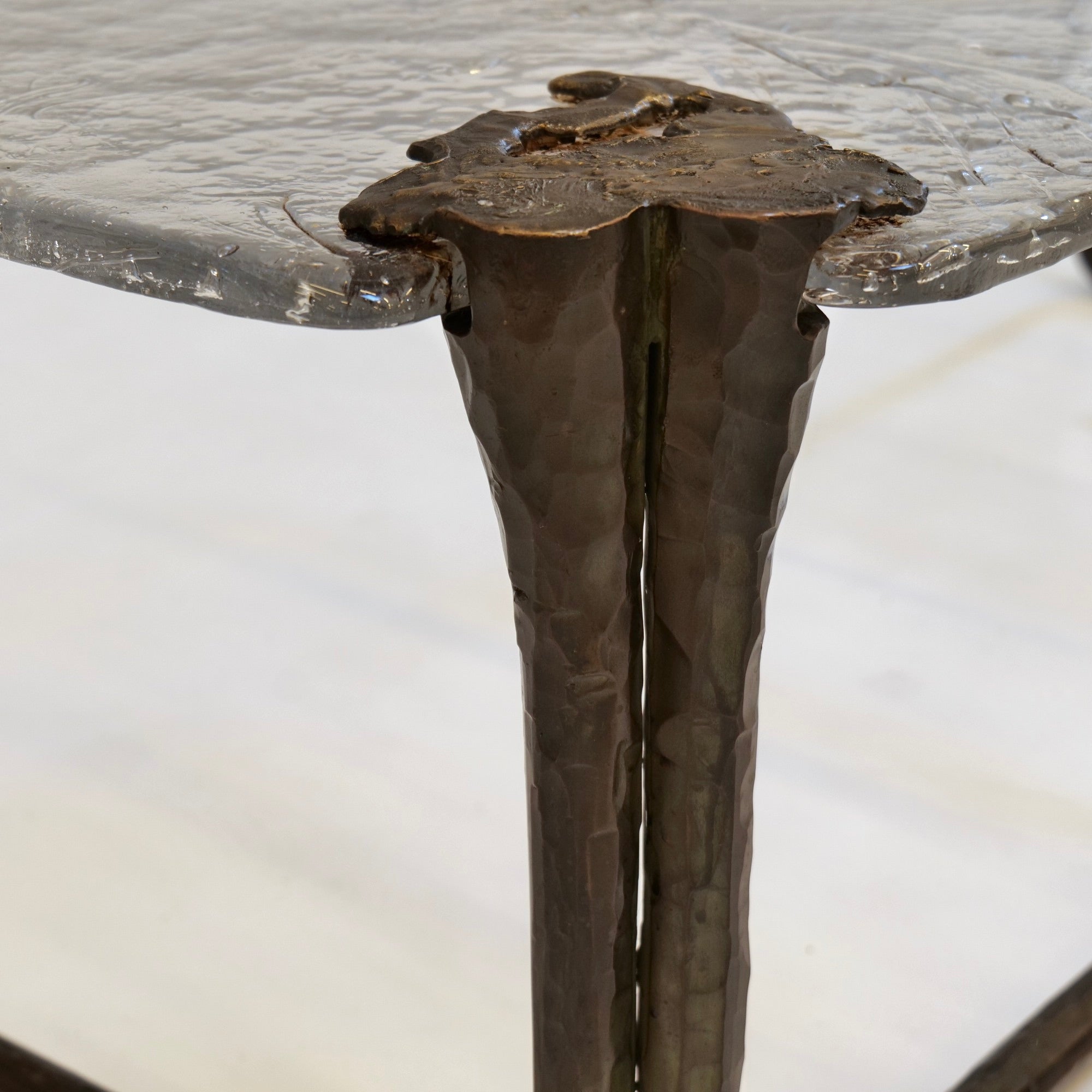 Rare organic console tables made out of forged bronze and cast crystal glass