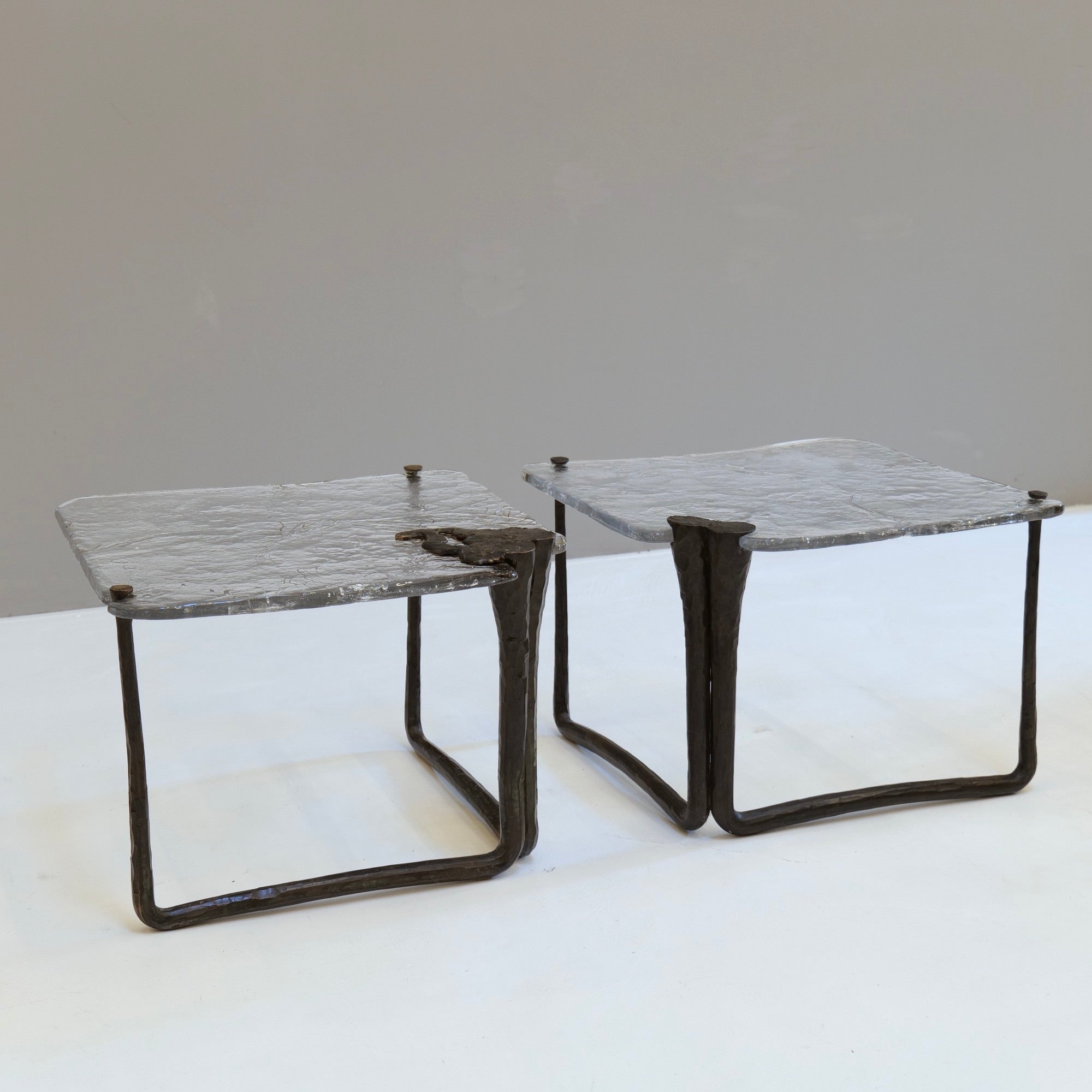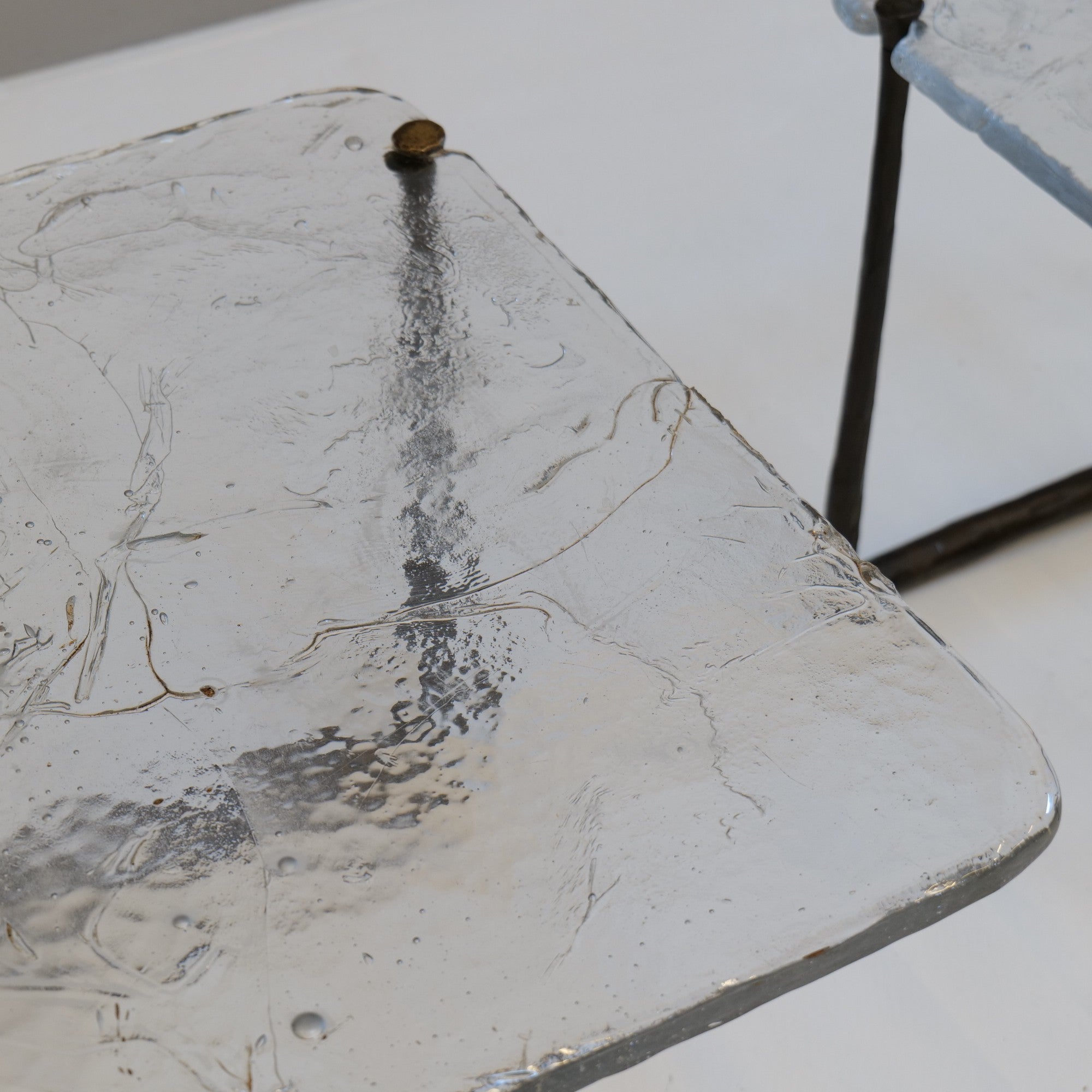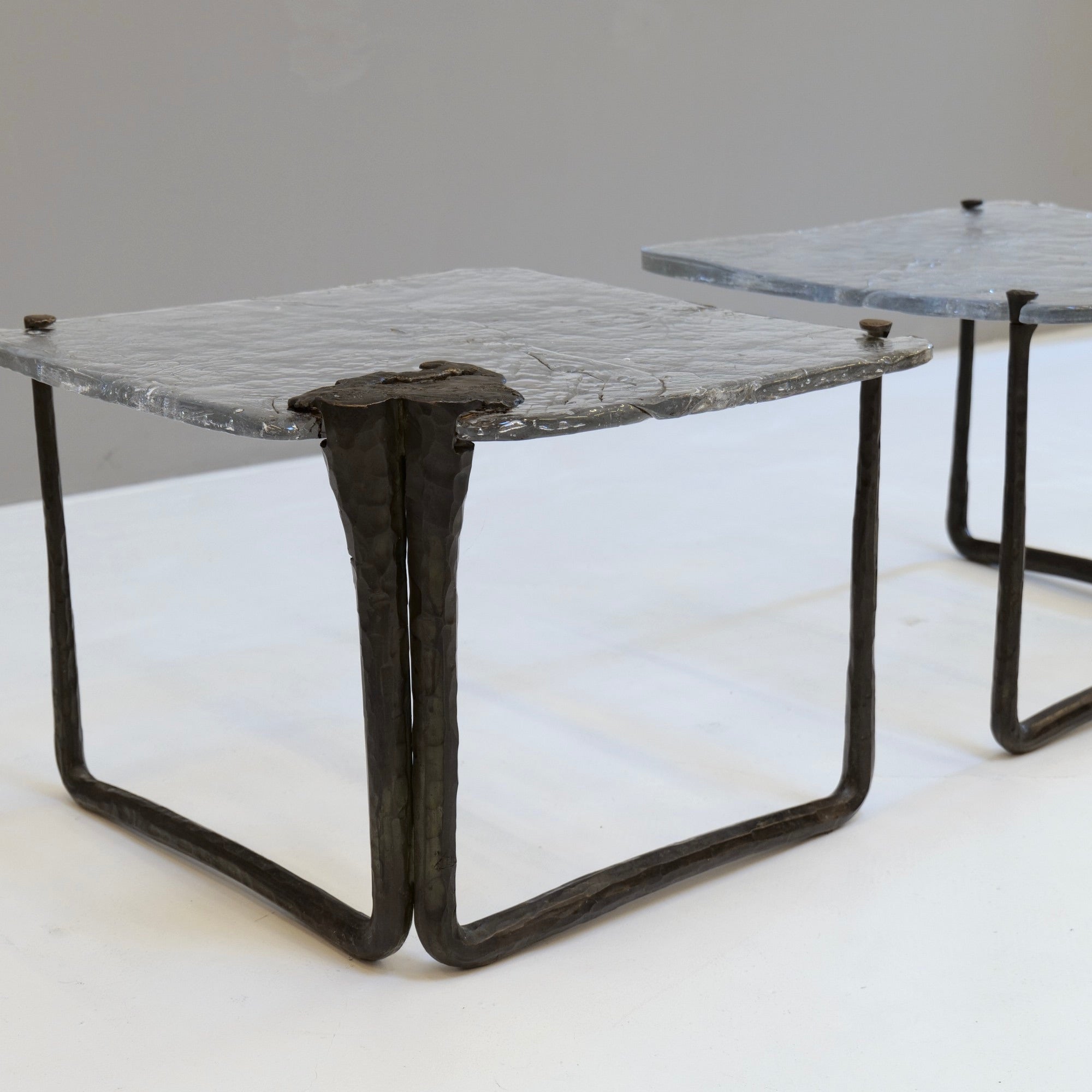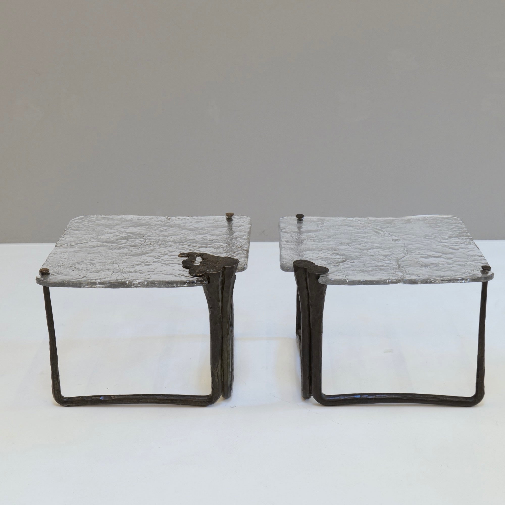 Rare organic console tables made out of forged bronze and cast crystal glass