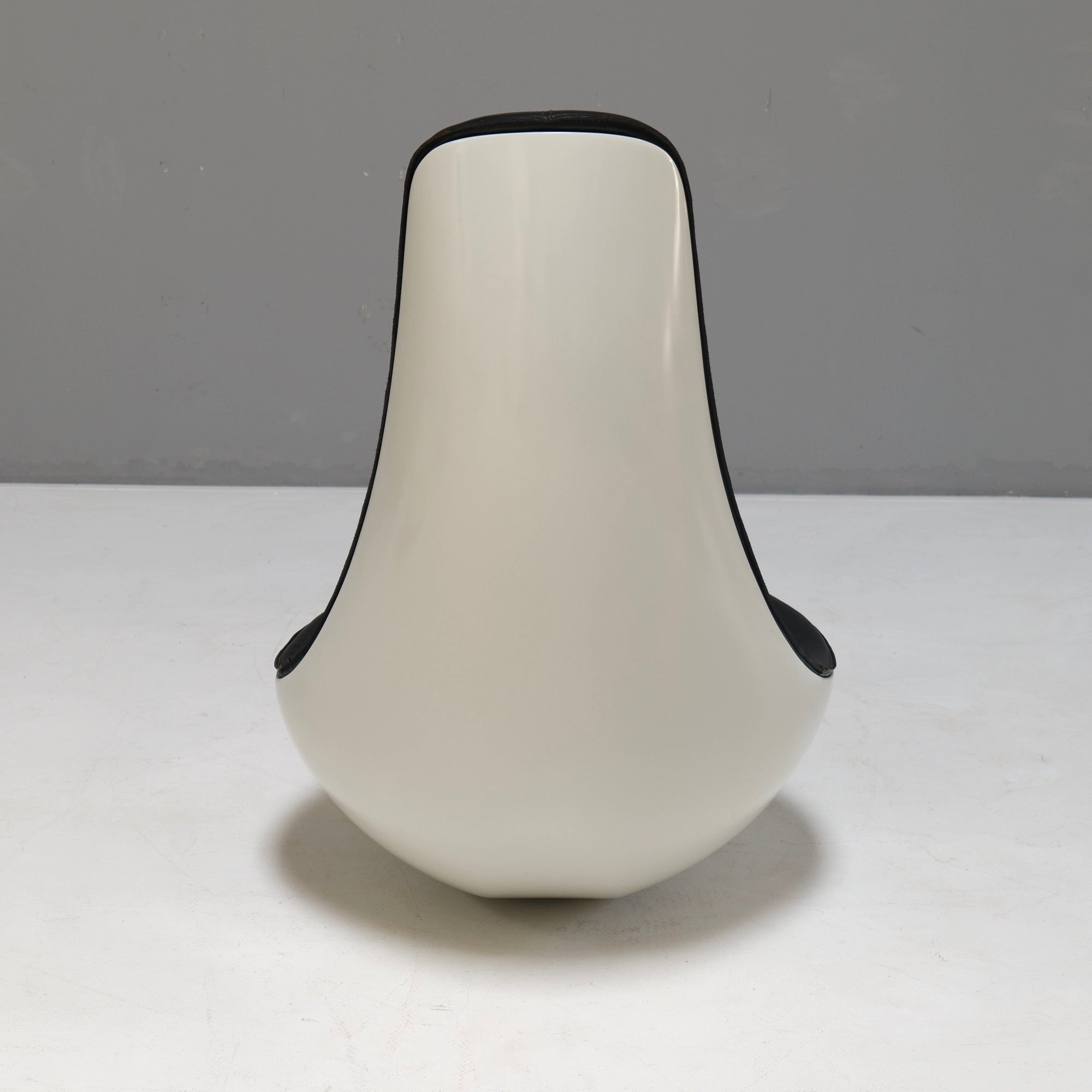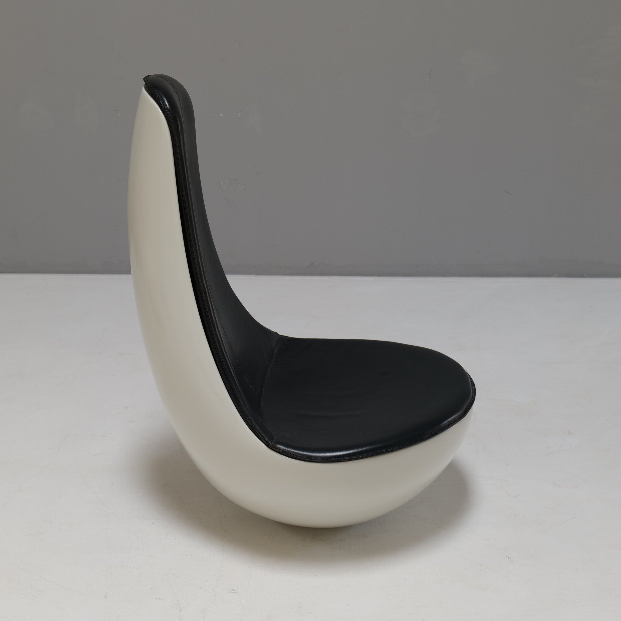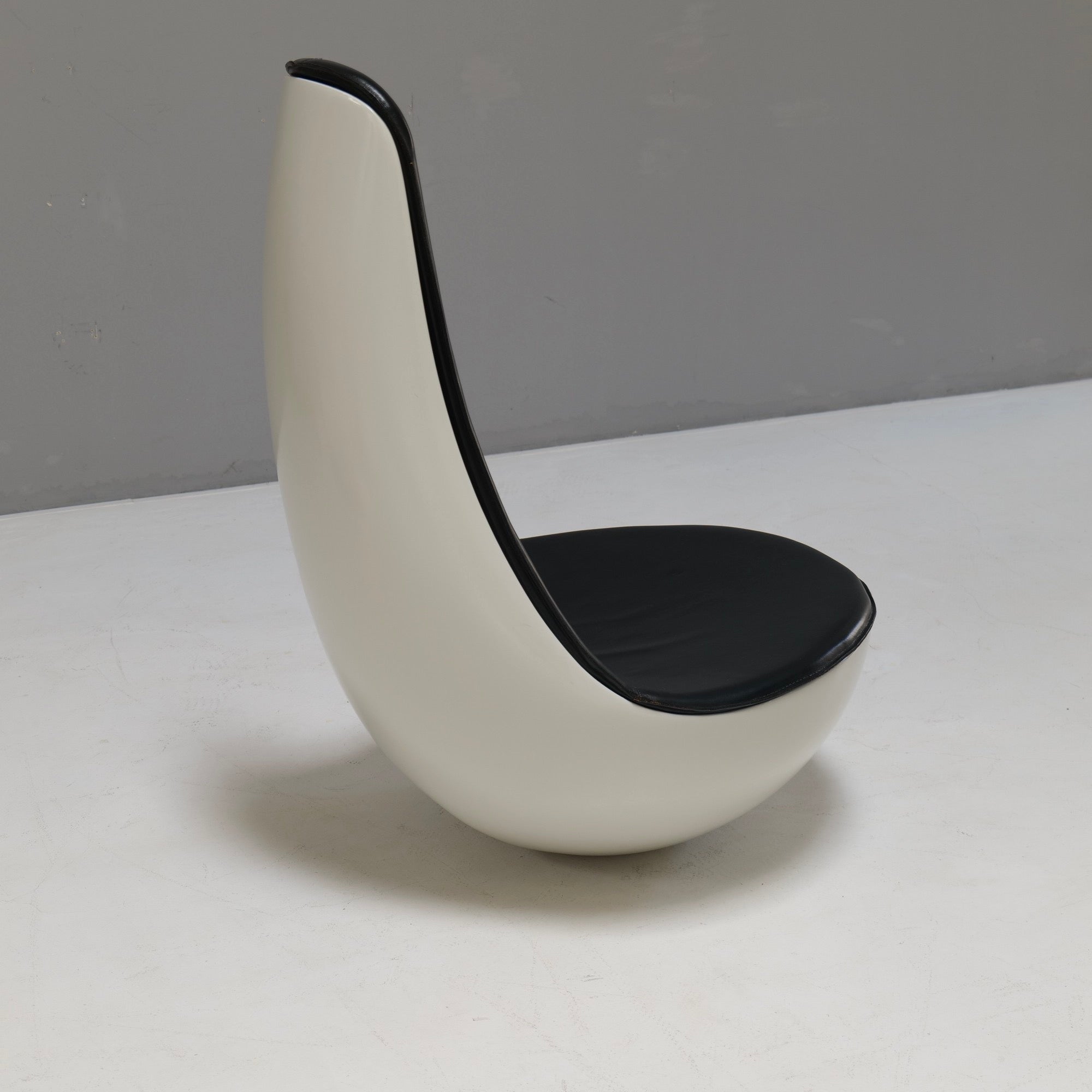 A rare and iconic piece of Space Age design, the FG 2005 rocking chair was created by Wolfgang Feierbach in the late 1960s. Crafted from a solid fiberglass-reinforced shell with iron powder and finished in elegant black leather upholstery, this sculptural lounge chair combines futuristic aesthetics with exceptional comfort. Its distinctive form and heavy, stable base make it a true collector’s item.