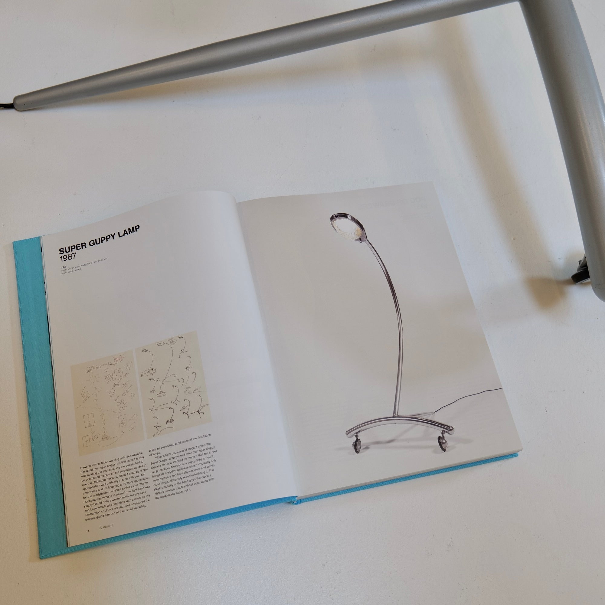Marc Newson was in Japan collaborating with Idée when he created the Super Guppy, his first lamp creation. As his time there was coming to a close, it meant the project needed to be finished swiftly, so the fortunate idea to utilize the common Tokyo streetlight head through simple appropriation aligned perfectly with both his deadline and his enduring appreciation for the readymade from his art school days—he describes this as his "Marcel Duchamp readymade moment." The light head was merely attached to a welded metal tubular neck and base, which was equipped with casters, allowing the device to roll around. Idée funded the project, providing him access to their small workshop where he oversaw the production of the initial batch of lamps.
