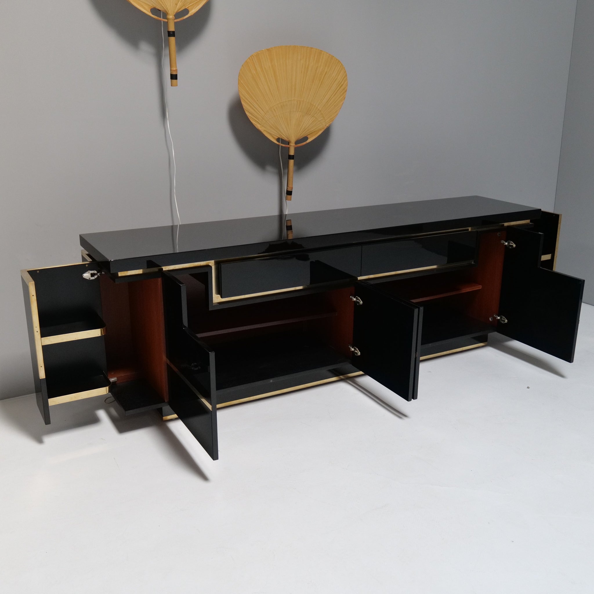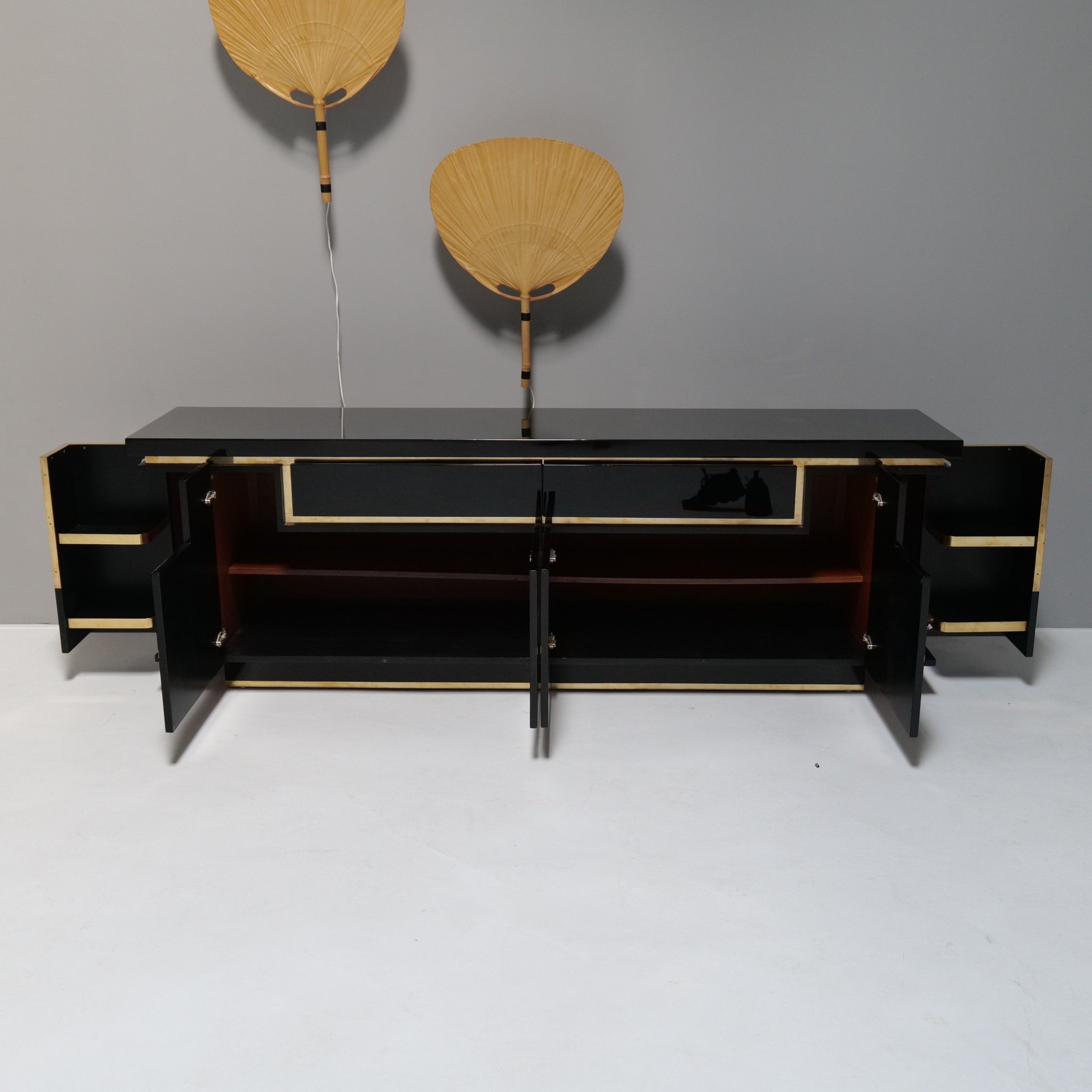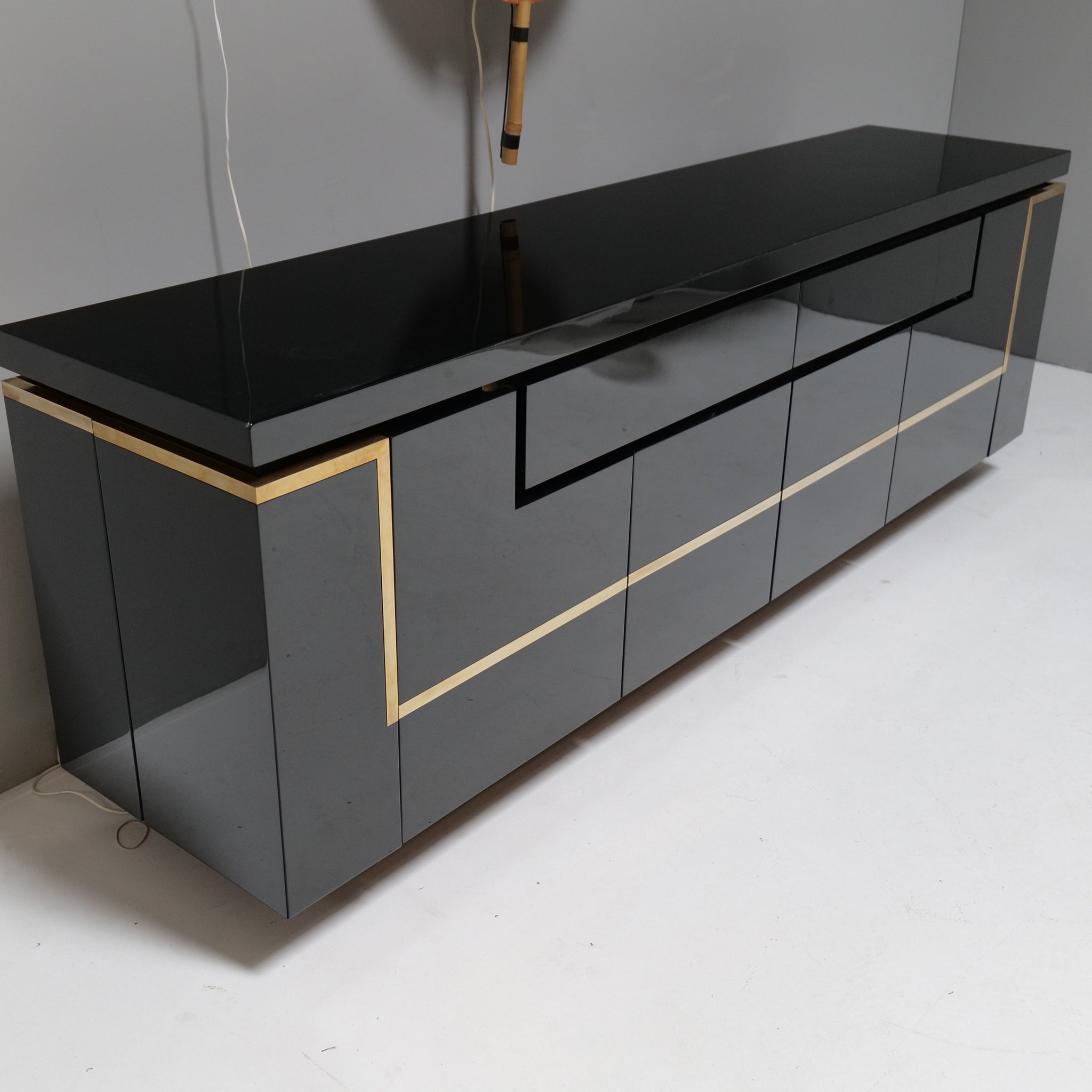 Large sideboard made of brass and black high-gloss piano lacquer.